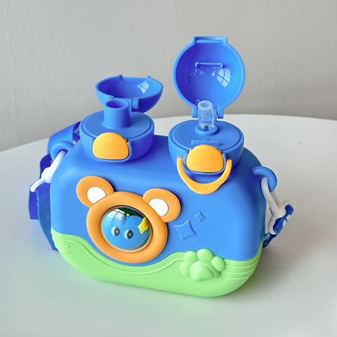 Botella de agua de plástico con diseño de cámara de oso bonito de dibujos animados de verano de 600ml con pajita doble para estudiantes y niños